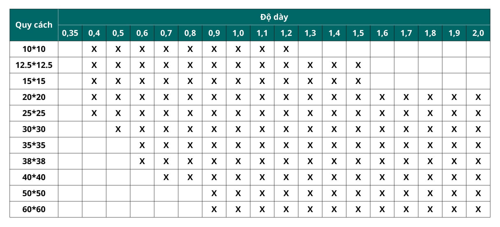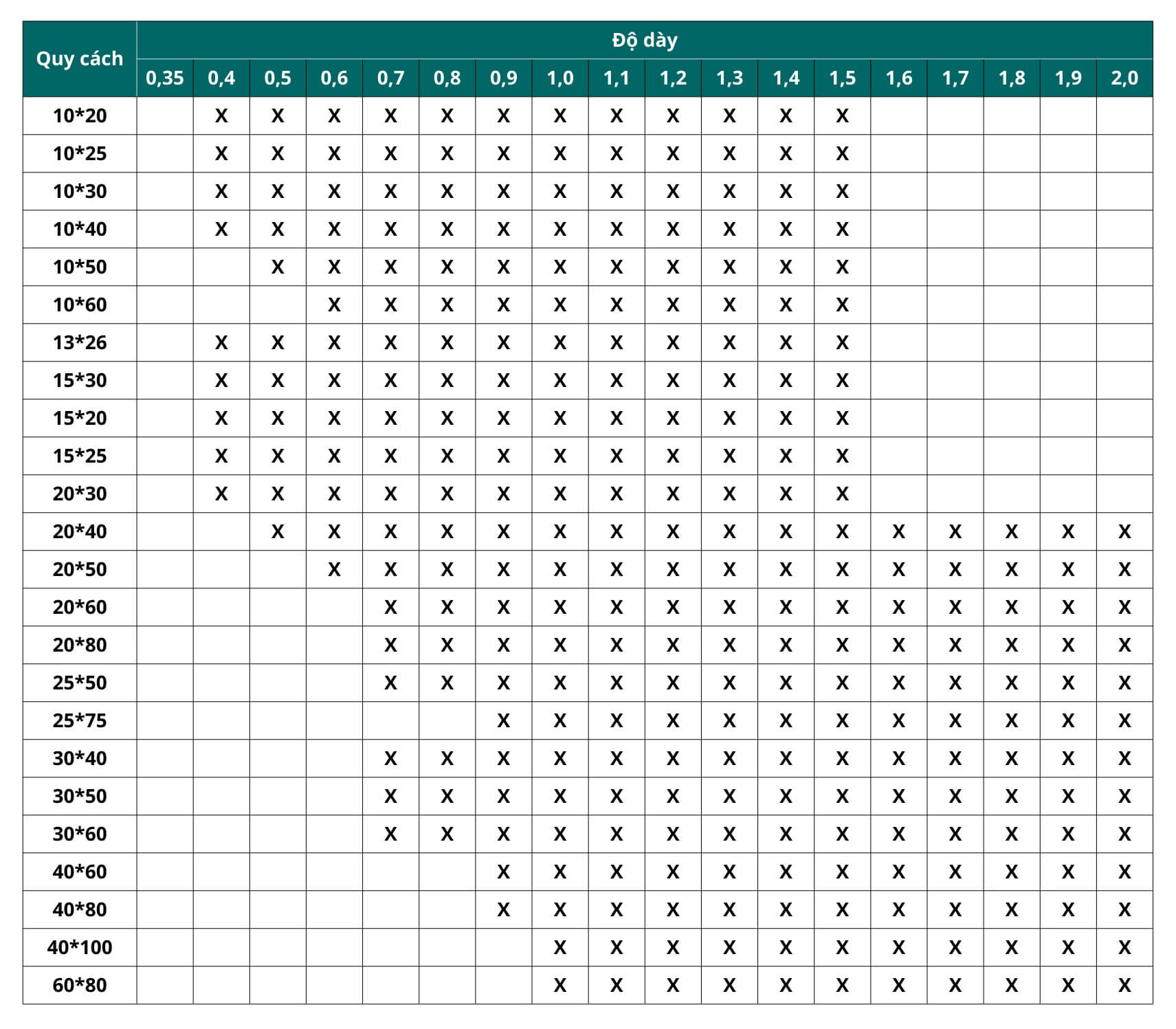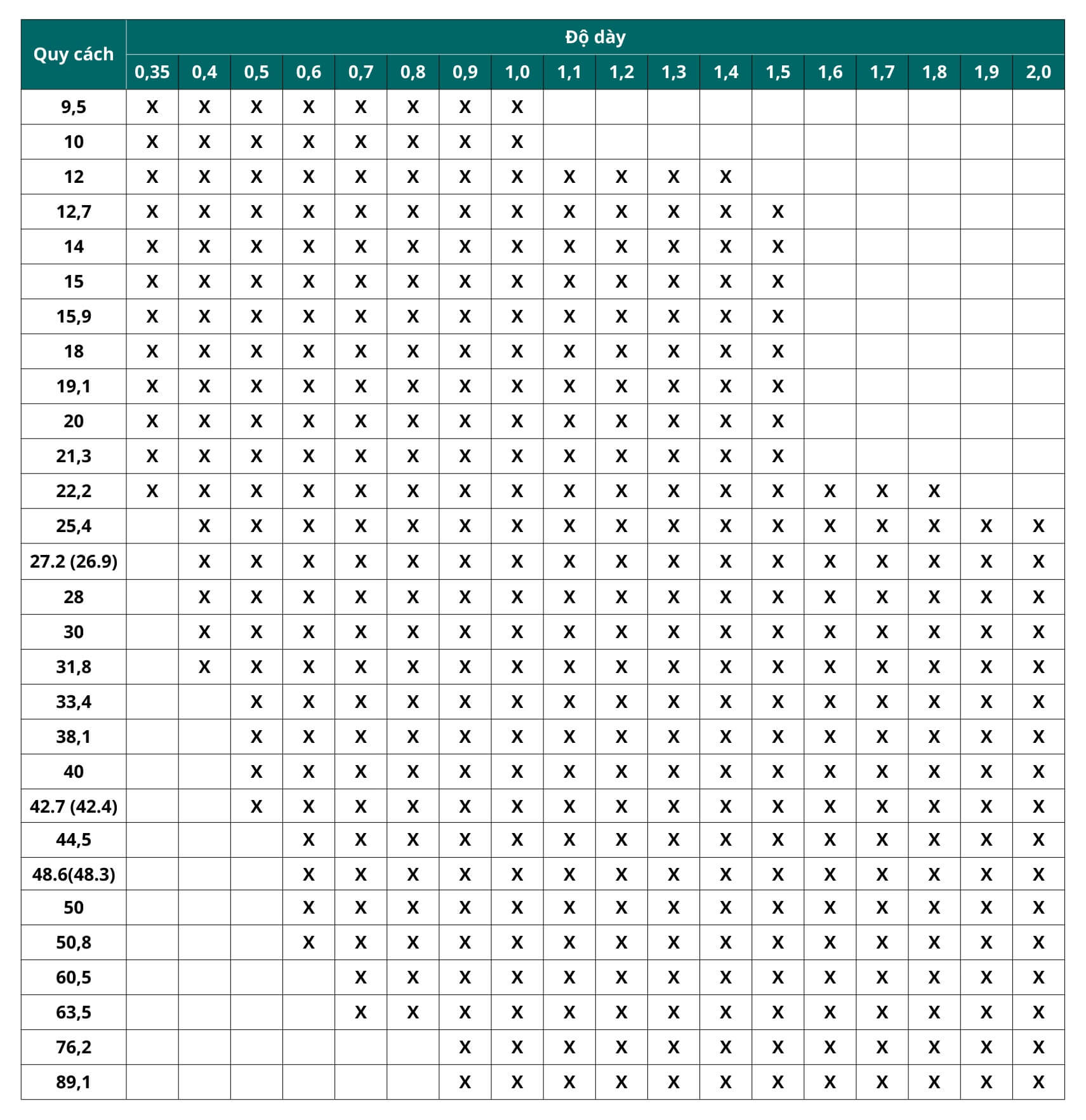 Để giúp khách hàng dễ dàng lựa chọn đúng loại ống phù hợp với dự án, Inox Đại Dương công bố phạm vi sản xuất tiêu chuẩn dựa trên năng lực thực tế của hệ thống khuôn – máy cán – công nghệ hàn hiện tại. Bảng dưới đây thể hiện những kích thước – độ dày – chủng loại ống mà chúng tôi có thể sản xuất ổn định, đồng nhất và đáp ứng đúng dung sai kỹ thuật.